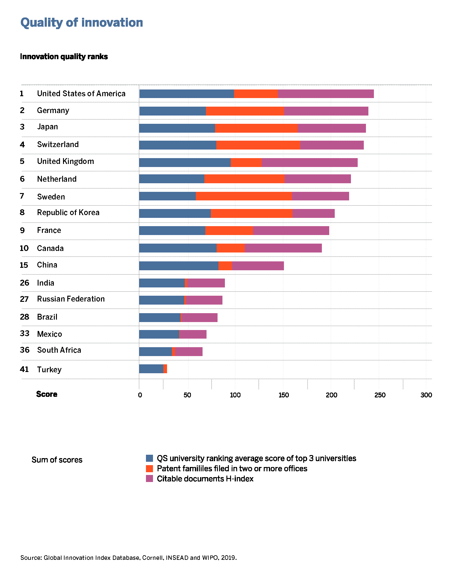 The United States of America regains the top rank in innovation quality. For the first time, Germany has moved up to second, followed by Japan on the third position. The patent related indicator contributes in a broad variety to the innovation quality ranking of the countries. North America, the United Kingdom and China are going local, whereas other European countries and Korea are seeking more often international patent protection. Sweden gains the first position on patent families (up from 5th).